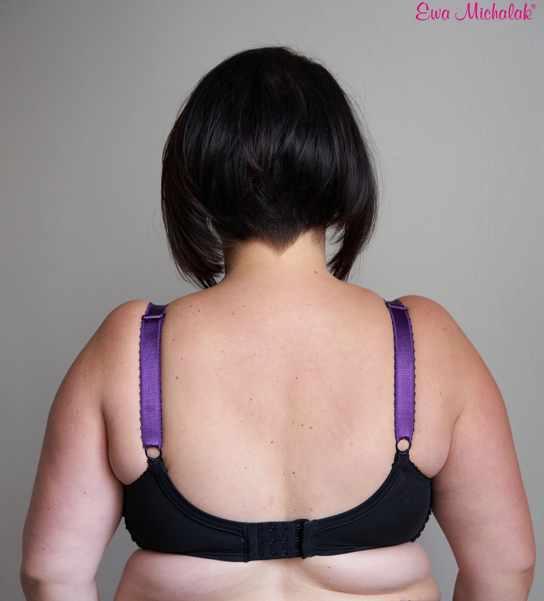 The bra features cups with more coverage, going round the breasts keeping a tight reign on them.