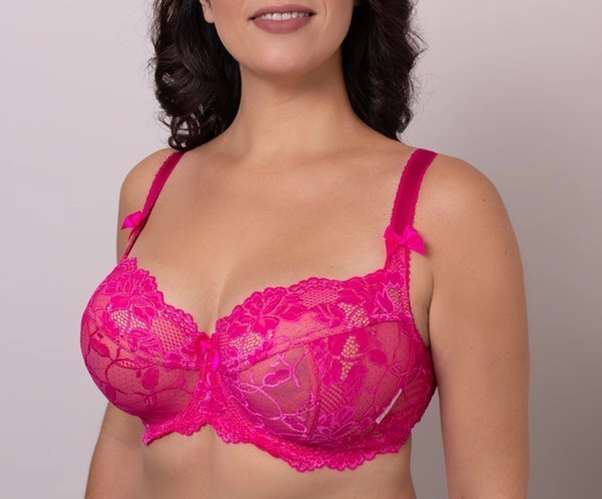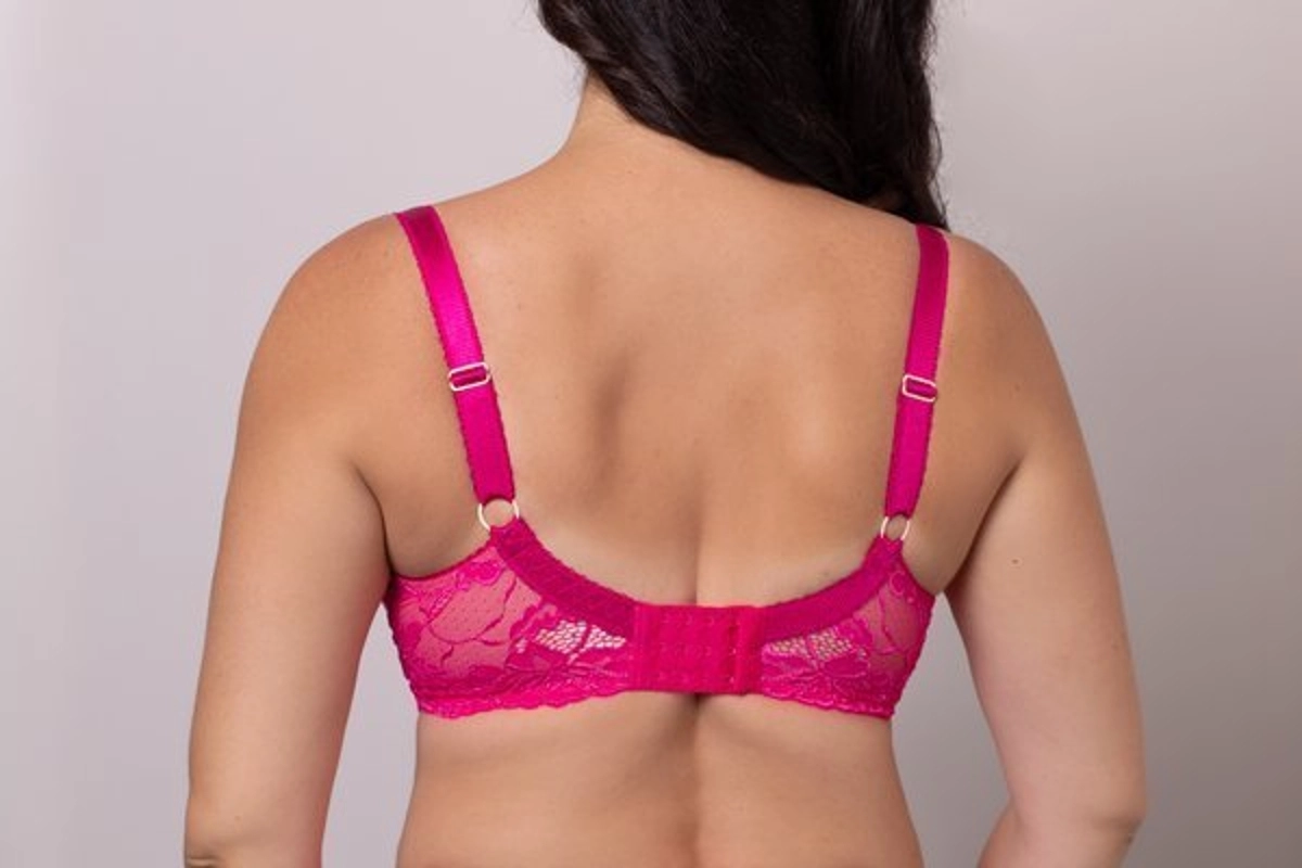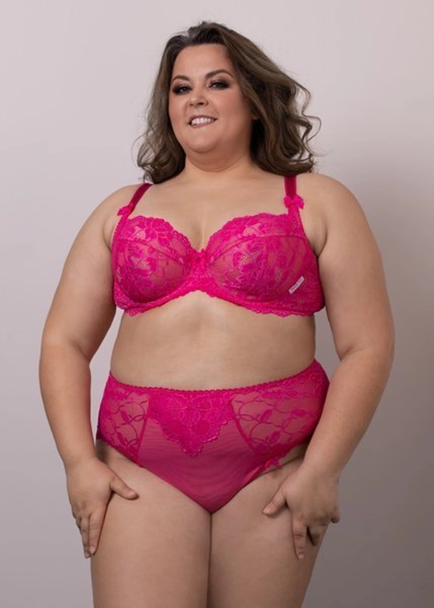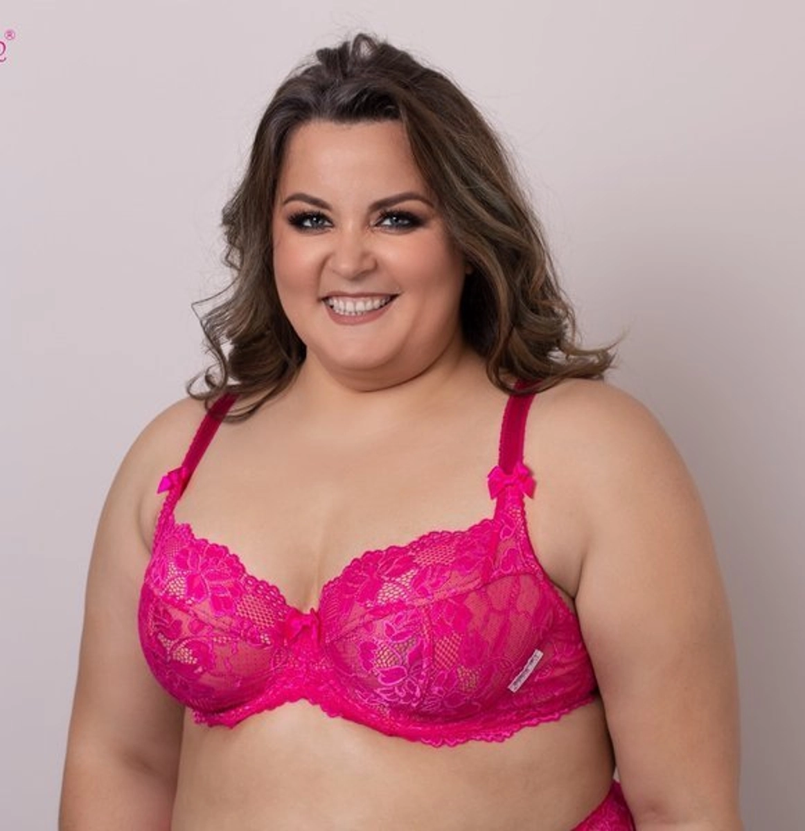 Cały stanik wykonany z elastycznej, szlachetnej koronki w kolorze różu na podbiciu z beżowej dzianiny. Dzięki zastosowaniu elastycznej koronki na górnej krawędzi misek stanik dopasowuje się nawet do asymetrycznego biustu ;)