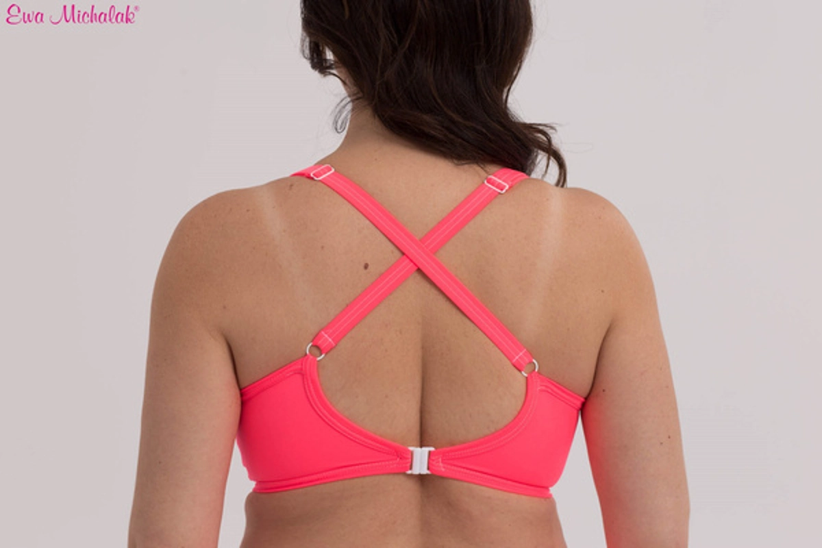 Biustonosz do kostiumu kąpielowego z niskim mostkiem i możliwością przepinania ramiączek na krzyż.